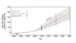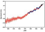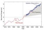 Auch der Meeresspiegelanstieg sollte so gering wie möglich gehalten werden, denn das Potential, welches hier zu einer Gefährdung von Mensch, Gesellschaft und Landschaften mit ihren Ökosystemen führen kann, ist erheblich. Bis zum Jahrhundertende hat der IPCC-Bericht von 2007 einen Anstieg von 18-59 cm prognostiziert, je nachdem, welche Mengen an Treibhausgasen in die Luft geblasen werden [21, 38]. Dieser Bericht wurde aufgrund neuerer Daten vor dem Klimagipfel in Kopenhagen (2009) in der Copenhagen Diagnosis (2009) noch verschärft [44, 45]. Satellitendaten haben ergeben, dass der Meeresspiegel um 80% schneller steigt, als im IPCC-Bericht von 2007 dargestellt [Abb.9]. Danach wurde der Meeresspiegelanstieg neu berechnet. Die Berechnung hängt natürlich vom Anstieg der Temperatur und von der Berechnungsmethode ab. Bis zum Jahrhundertende wird nun ein Meeresspiegelanstieg um 0,5-2 m erwartet. Innerhalb der nächsten 300 Jahre könnte der Meeresspiegel um 2,5-5,1 m steigen [46, Abb.10].