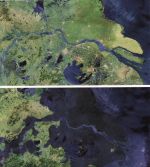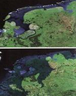 Ein Meeresspiegelanstieg um einige Meter hätte natürlich enorme Auswirkungen auf viele Länder, zumal viele Großstädte sich in Küstennähe befinden. Bei einem Anstieg um 6 m, also etwa dem Verlust der Hälfte des Eises von Grönland und der Westantarktis oder dessen Abgleiten ins Meer, wären z.B. die Niederlande und Städte wie Shanghai und Miami weitgehend unter Wasser [Abb.11 Abb.12].