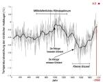 Teile von Diagrammen und Kurven wegzulassen ist eine gängige Methode unter einer Reihe von Klimaskeptikern. Auch Rubino & Zanchettin (2009) gehen in ihrem Buch "Pandemie eines Klimawandels: Das Ende" so vor [72]. Eines der Hauptdiagramme des Buches [Abb.13] erstellten die Autoren aus den Daten von Moberg et al. (2005) [73]. Im Unterschied zu der Originalliteratur [Abb.14] lassen Rubino & Zanchettin die Temperaturkurve etwa bei 1960 enden. Die grün markierten gemessenen Daten aus der Originalliteratur, werden weggelassen. Nur so können die Autoren zu der fälschlichen Aussage kommen, dass es "in den letzten zweitausend Jahren wärmere Perioden als heute gegeben hat" (Rubino & Zanchettin 2009 S. 132). Im Mittel von Dekaden war es jedoch im Jahre 2000 auf der Nordhalbkugel um etwa 0,5°C wärmer als das mittelalterliche Klimaoptimum und als der Durchschnitt von 1961-1990 (Abb.13; IPCC-Bericht 2007) [81]. Dass Rubino und Zanchettin dies wissen, zeigen sie sechs Seiten weiter in ihrem Buch bei einem Temperaturdiagramm von 1900 bis 2007 (im Buch Abb.7.5). Dieses zeigt eine Temperaturerhöhung um 0,7°C seit 1900. In dieser Abbildung fehlt jedoch das mittelalterliche Klimaoptimum, so dass der Vergleich mit diesem nicht möglich ist.