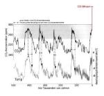 Ebenso verfahren sie mit der CO2-Kurve: In der Übersichtsabbildung [Abb.15] ist die steil ansteigende Kurve des heutigen CO2-Anstiegs weggelassen und zeigt für heute den vorindustriellen Wert von 280 ppm an (vgl. auch Abb.1). In Detaildiagrammen (z.B. im Buch Abb.6.3 S.119) ist der heutige Wert von 386 ppm enthalten, wobei dann die Übersicht fehlt. Nur so können sie zu Aussagen kommen wie: "(...) der menschliche Beitrag zum 'CO2-Karussell' im Klimasystem ist noch bescheiden." (S. 95). Eine solche Aussage ist unverständlich, besonders wenn das anthropogene CO2, welches heute noch von den Ozeanen aufgenommen wird, mit einbezogen wird. Das anthropogen freigesetzte CO2 beläuft sich dann auf etwa 200 ppm, mehr als zwei Drittel des vorindustriellen CO2-Gehaltes der Atmosphäre!