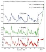 Jetzt sind wir aber dabei, dieses fein abgestimmte Gleichgewicht zu stören. Seit der Industrialisierung hat sich der CO2-Gehalt in der Atmosphäre von 0,027% (270 ppm) auf 0,0386% (386 ppm) im Jahr 2009 erhöht. Der Methan-Gehalt (CH4) der Atmosphäre hat sich fast verdreifacht [Abb.1]. Dabei ist ungefähr die Hälfte des vom Menschen in die Atmosphäre gebrachten CO2 in den Ozeanen und der Biosphäre verschwunden, wir haben also schon an die 200 ppm CO2 erzeugt [6]. Wie die Abb.1 zeigt, geschieht die Zunahme dieser Treibhausgase heute in einer Geschwindigkeit und einem Ausmaß, wie es in den letzten 400 000 Jahren nicht vorgekommen ist.